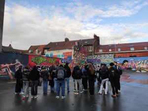 Les élèves de 1 STMG A sont partis à la découverte ce matin des fresques murales de Lille, visite organisée par le Collectif Renart dont l’objectif est de promouvoir l’accès à l’art en privilégiant le lien social et en présentant la diversité des démarches, époques et styles de l’art mural contemporain.